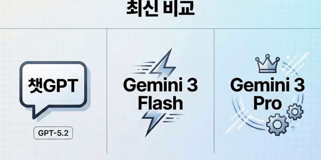 | 비교 포인트 | 챗GPT (GPT-5.2) | 제미나이 (Gemini 3 Flash) | 제미나이 (Gemini 3 Pro) |